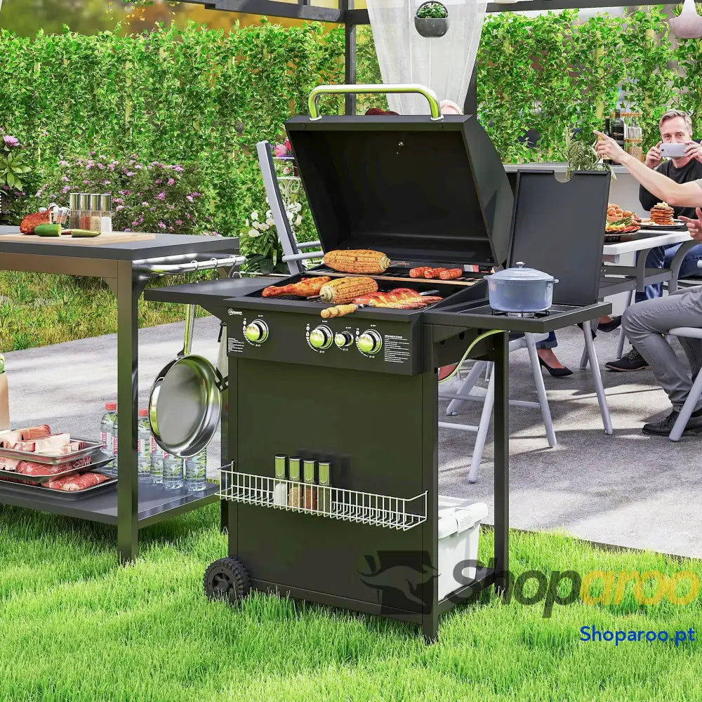 Acenda a sua barbecue de jardim a gás da Outsunny e prepare um churrasco perfeito. Com uma grelha para manter o calor e um queimador lateral ideal para aquecer molhos ou preparar acompanhamentos, oferece toda a versatilidade que precisa. Os queimadores ajustáveis individualmente e o termómetro duplo permitem controlar a temperatura com facilidade. Equipado com rodas robustas, pode movê-la facilmente do interior para o jardim, garantindo conveniência e desempenho excepcionais
